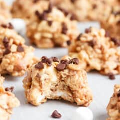 Add rice krispies and marshmallows to a large bowl and pour in the peanut butter mixture then sprinkle in the frozen chocolate chips. Use a rubber spatula to stir to combine. We use frozen chocolate chips so they don’t melt in the warm chocolate and peanut butter mixture.