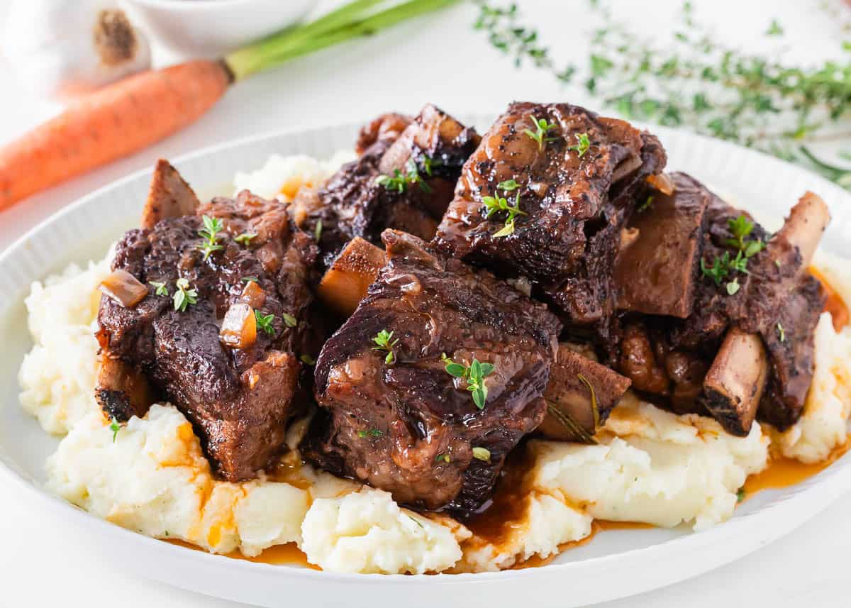 Beef short ribs are quickly seared, then slowly braised in a Dutch oven with a simple red wine sauce until they’re fall-apart tender. That slow simmer builds deep flavor and creates a rich sauce I love to serve over creamy mashed potatoes for Sunday dinner or special occasions.