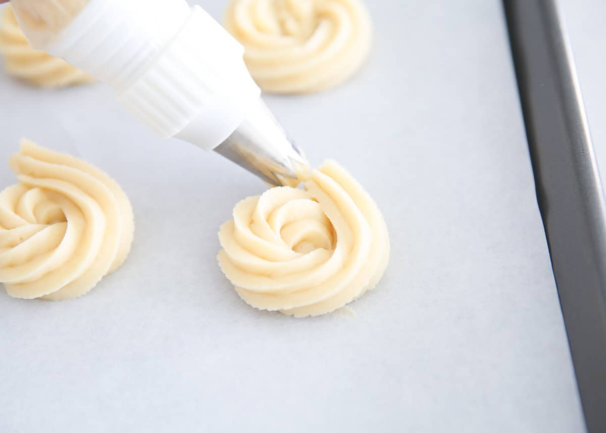 - In a piping bag fitted with an #826 open star pastry tip, add the dough. Pipe cookies in circles onto the baking sheet and follow instructions from there.
