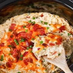 Cover with the lid and cook on low for 5-6 hours or high for 3-4 hours. Once it is done cooking, shred the chicken right in the pot, pulling away at the meat using 2 forks. Then, add the green chiles, bacon, cheddar cheese, and green onions.