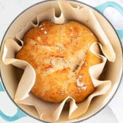 This homemade bread is similar to artisan bread but cooked in a Dutch oven instead of on a pizza stone. Cooking it this way gives it a crusty outside and makes the bread soft and tender with airy holes in the center.