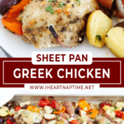 Greek sheet pan chicken is bursting with Greek flavors and beautiful colors! Seasoned chicken and caramelized veggies are roasted together resulting in a quick and easy dinner ready to impress!