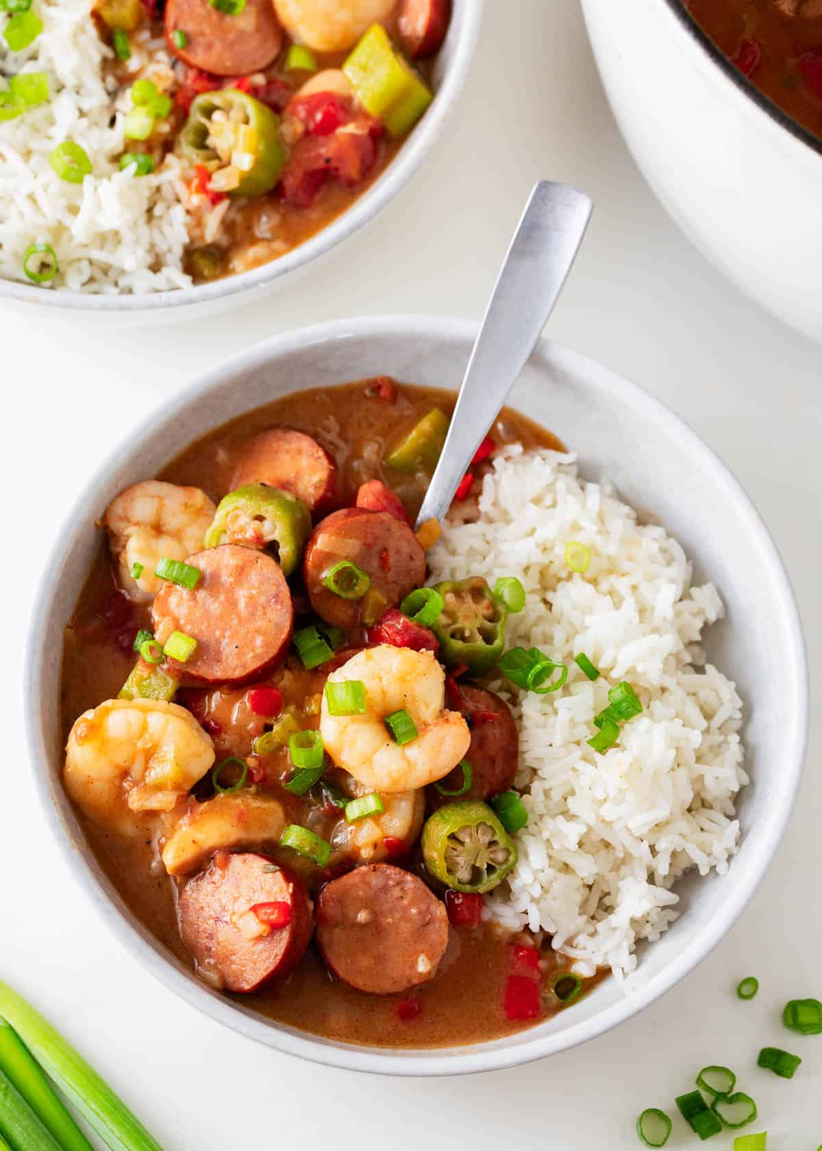 - Serve gumbo warm over cooked white rice and topped with sliced green onions.