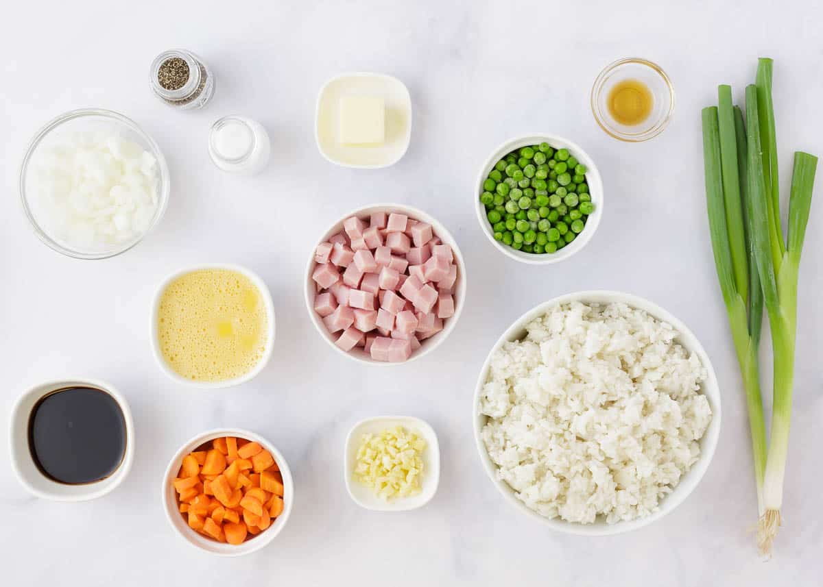 - Cooked rice: Preferably leftover cold rice. I use jasmine rice, but any white rice or brown rice can be used. I often double stovetop rice to have it on hand for this easy ham fried rice recipe!
