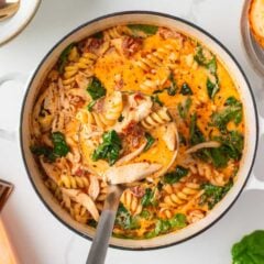 Marry me chicken soup is a one-pot recipe made with a creamy, tomato-based broth, tender noodles, sun dried tomatoes, spinach, and red pepper flakes for kick. The noodles are cooked in the broth, and for convenience, we’re using shredded rotisserie chicken!