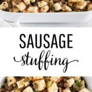 This old fashioned sausage stuffing is a family favorite! Made from scratch with dried bread, savory sage sausage and herbs and seasonings then served casserole style!