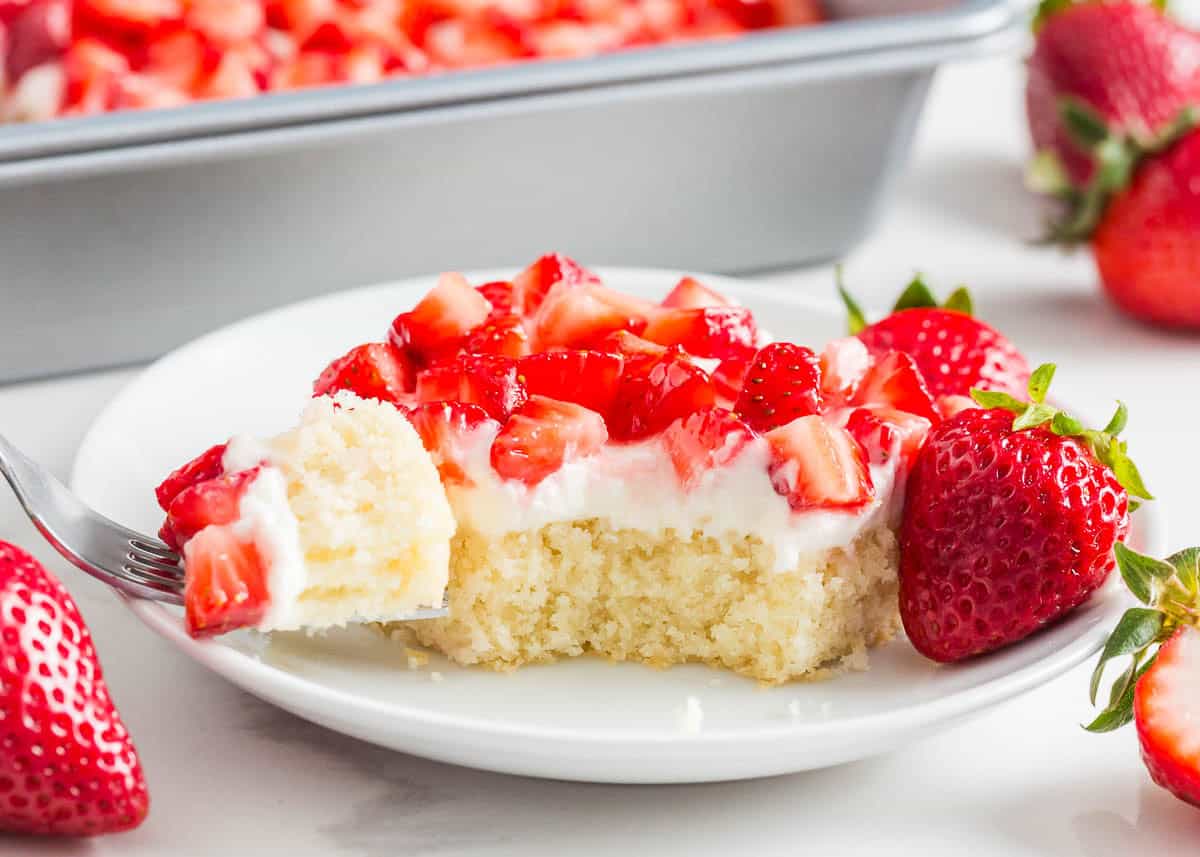 Strawberry Sheet Cake. This airy cake is made with vanilla cake batter, a few pantry staples, sour cream, and fresh strawberry purée.